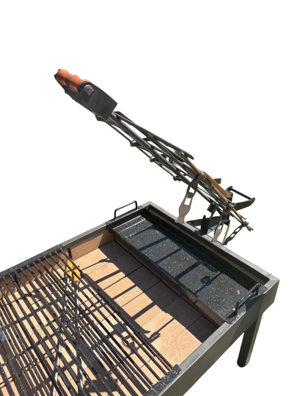 Este fogón asador es transportable e incluye 2 rejillas enlozadas, 1 plancheta enlozada, 1 asador de hierro y 1 mesadita de madera.